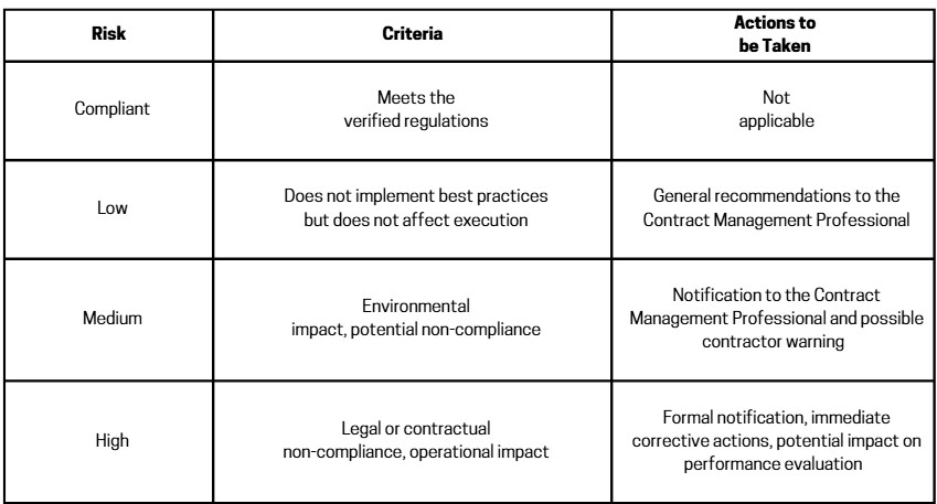 Findings detected during verification are classified according to their impact on contract execution, allowing the definition of necessary corrective actions: