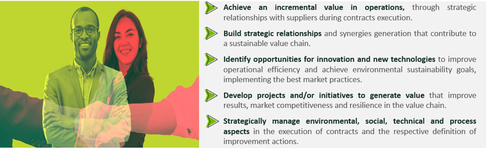 The PRM counts with a broadly review about performance, results obtained, improvement opportunities and potential joints for value generation initiatives, among other critical success factors. This analysis is based on a strategic vision of the significant suppliers, and not on the execution of a specific contract, accordingly, in these meetings, issues associated to tariffs negotiation, administrative and transactional aspects or portfolios of supplier´s goods and services are not reviewed.