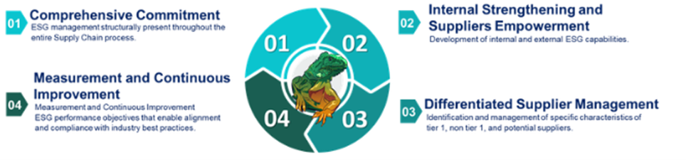 In 2025, the Supplier ESG Program was consolidated, aiming to identify and assess potential ESG risks and opportunities, and to plan measures that ensure strong sustainability performance throughout the supply chain. The program is align with the United Nations Sustainable Development Goals and international best practices, evaluated through global benchmarks such as DJSI and CDP, ensuring integration with Ecopetrol’s 2040 strategy “Energía que transforma” by managing the Responsible Supply Chain as a material issue.