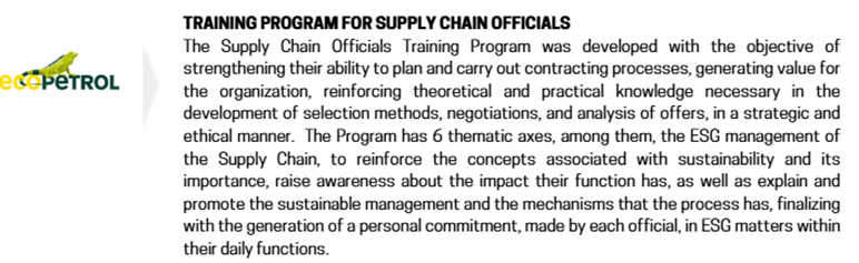 The Supplier ESG program was presented to and approved by Ecopetrol’s Board of Directors during the Corporate Governance and Sustainability Committee, with the commitment to monitor the goals and achievements on an annual basis (at least once a year) to this body.