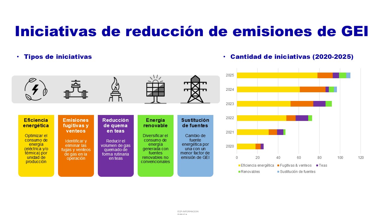 Las iniciativas de reducción de emisiones operativas de GEI se clasifican en cinco grupos: Eficiencia energética, Eliminación de emisiones fugitivas y venteos, Reducción de quema en teas, Incorporación de energía renovable, y Sustitución de fuentes. En 2025, 110 iniciativas aportaron reducciones de emisiones de GEI, de las cuales, las de eficiencia energética representan ~72% del conjunto. En el periodo 2020 – 2025, 445 iniciativas de reducción de emisiones de GEI han reportado desempeño buscando acercarnos al cumplimiento de nuestras metas.