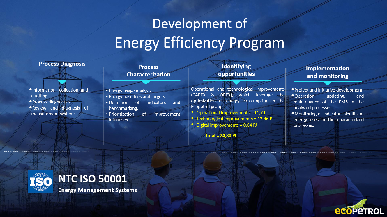 The strategy add value and maintain optimal energy performance in the operations and non-industrial facilities in Ecopetrol Group, in order to achieve this, several initiatives have been Identified, evaluated, and implemented based on conducted energy audits, resulting in:
