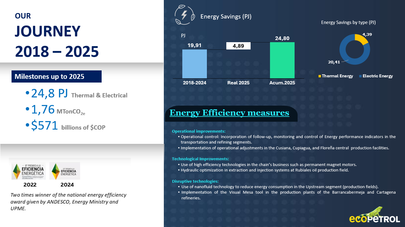 Ecopetrol’s Energy Efficiency Strategy has set a target to reduce 25 PJ by 2030. This reduction represents 20% of its internal energy consumption and results in a mitigation of more than 1.2 MTonCO2e in emissions. These efforts are supported by investments and operational initiatives.