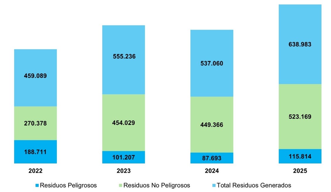 Durante los últimos cuatro años, la generación total de residuos mostró una tendencia creciente; sin embargo, en 2024 se logró una reducción del 2%. En 2025, esta volvió a incrementarse como resultado del mayor nivel de actividad operativa asociado a procesos de producción, mantenimiento, construcción y desmantelamiento.