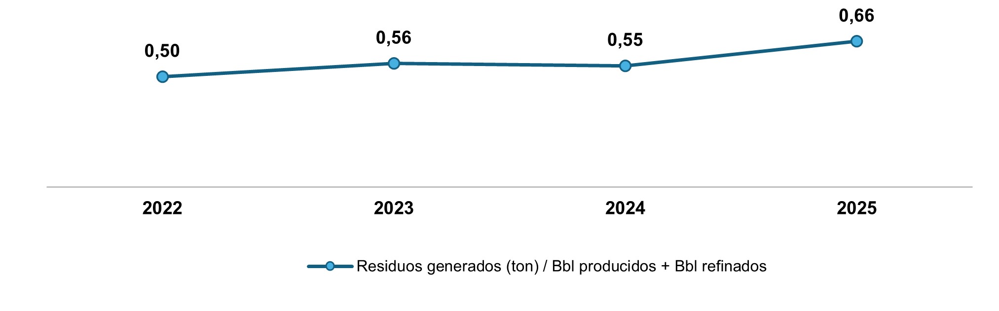 La intensidad de residuos (toneladas por barril de crudo producido y refinado) aumentó entre 2022 y 2023, disminuyó en 2024 en línea con la reducción de la generación total y volvió a incrementarse en 2025, alcanzando 0,66 toneladas por barril.