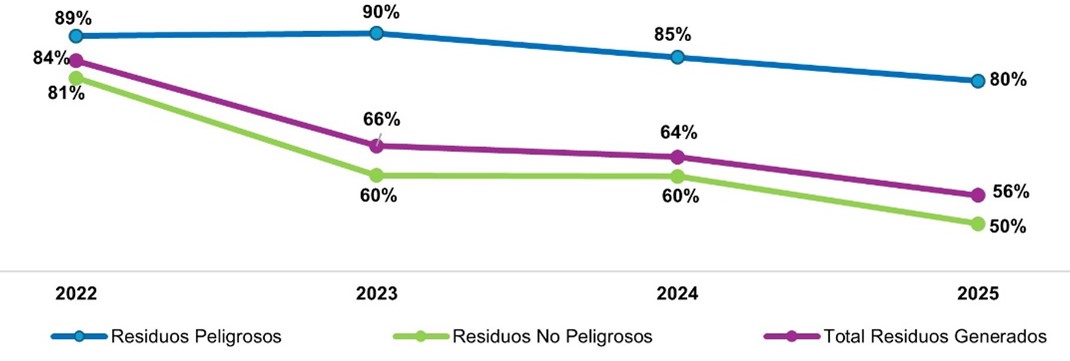 En el caso de los residuos peligrosos, aunque su manejo requiere procesos más especializados, también se evidencia una mejora. Entre 2022 y 2025, el porcentaje enviado a disposición final disminuyó del 89% al 80%, mostrando avances graduales en el uso de alternativas seguras de tratamiento.