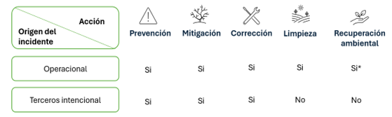 En el caso de contingencias de origen operacional, las acciones incluyen prevención, mitigación, corrección, descontaminación y recuperación ambiental.