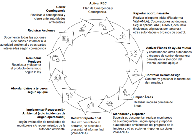 Posteriormente, se ejecutan labores de limpieza y remediación, cuando aplique, en cumplimiento de los lineamientos del Plan Nacional de Contingencia contra Derrames de Hidrocarburos, Derivados y Sustancias Nocivas, establecido por el Decreto 1868 de 2021.