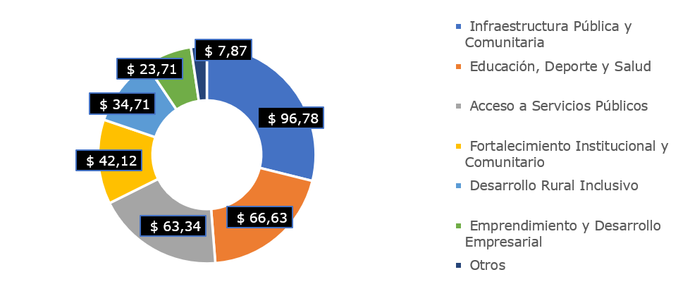 El 13% corresponde a los proyectos de soluciones para la producción ganadera y dotación de elementos y herramientas de trabajo comunitario. |