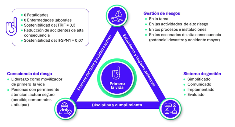 Ecopetrol incorpora en sus compromisos y políticas el principio cultural de “Primero la Vida”, orientado a salvaguardar la integridad de la vida en todas sus manifestaciones. En este marco, implementa el Sistema de Gestión HSE, con el objetivo de establecer los elementos necesarios para gestionar de manera adecuada los riesgos asociados a la salud ocupacional, proteger la integridad de las personas y promover el cuidado del medio ambiente.