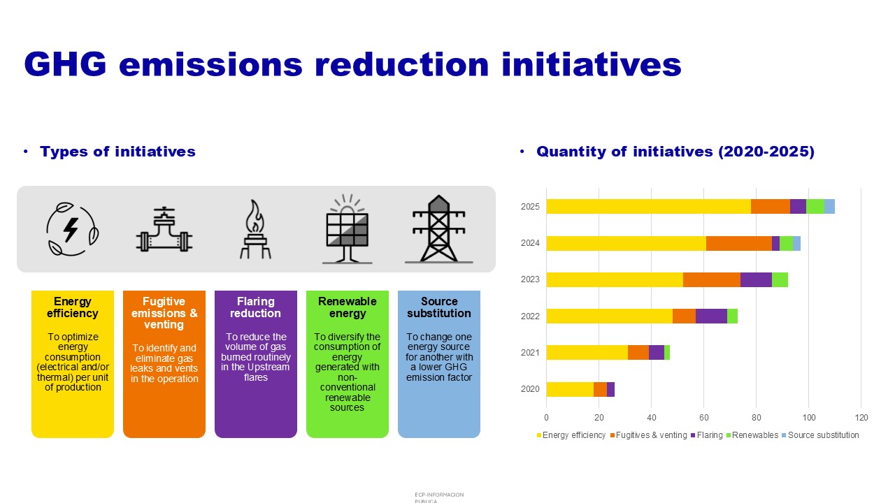 Ecopetrol establishes a voluntary annual goal for reducing GHG emissions, based on the identification of initiatives planned to come into operation in the respective year. In 2025, the reduction achieved by new initiatives implemented was 561.454 tCO₂e. The cumulative annual reduction in GHG emissions in the period 2020 - 2025 is 2.831.363 tCO₂e.