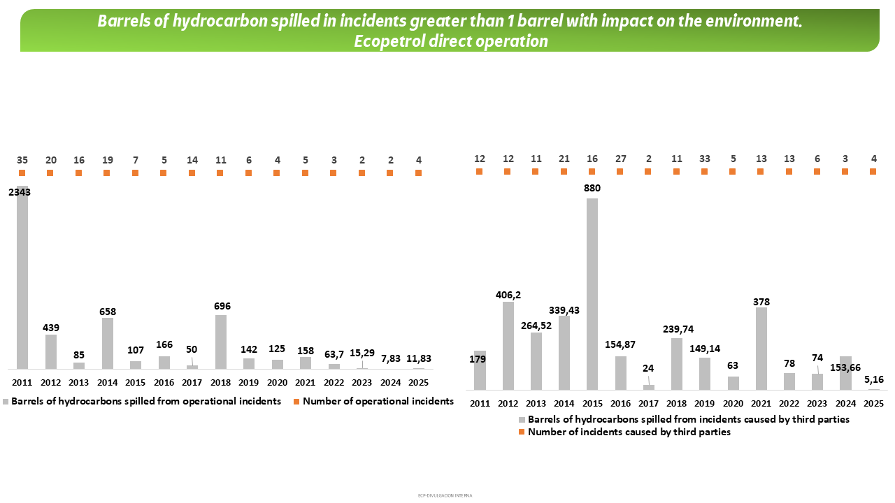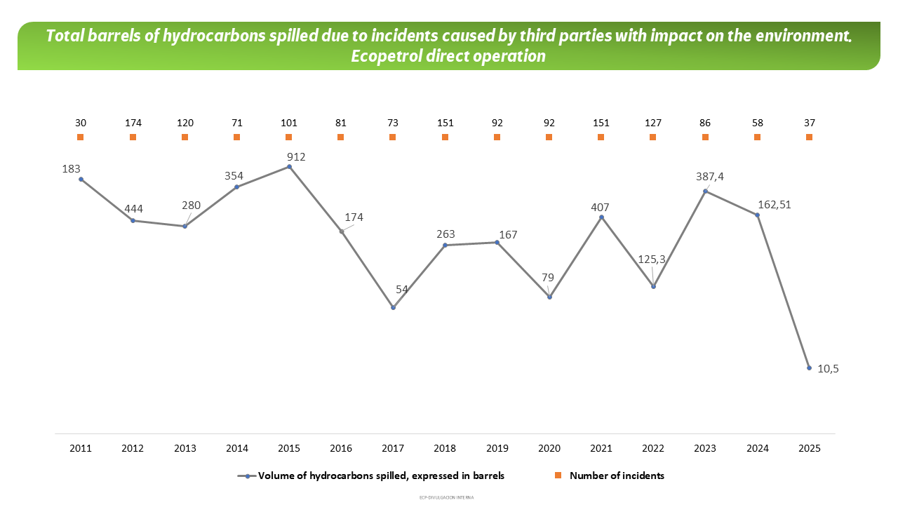 In line with this positive trend, during 2025 a total of 8 incidents involving hydrocarbon spills greater than 1 barrel were recorded in ECOPETROL S.A.’s direct operations, with environmental impact. The total volume spilled was 17 barrels.